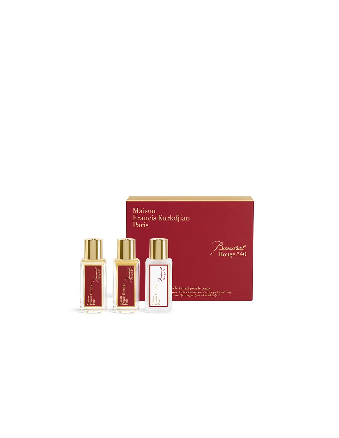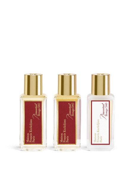 Edición Limitada. Es el ritual ideal para el cuerpo, con un aceite perfumado, un aceite centelleante y una bruma para el cabello. El aceite para el cuerpo deja la piel satinada y delicadamente perfumada, mientras que el aceite centelleante Rouge 540 de Baccarat, inspirado en el secreto del “rouge à l'or” o rojo oro, aporta el brillo del oro de 24 quilates. Como toque final, la bruma perfumada para el cabello, con su estela delicada y luminosa.